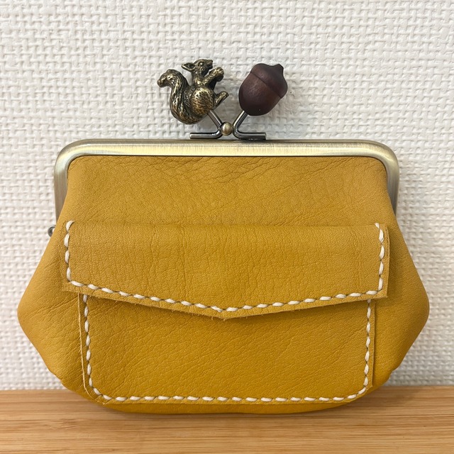 ぱかっと開くとお部屋が3つの親子がまぐち♪外ポッケが付いたリス&どんぐり口金の四角い本革ミニ財布