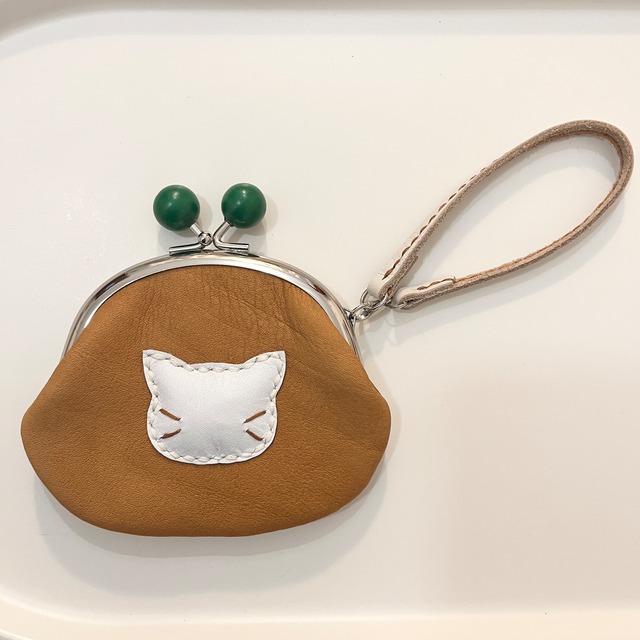 ニャンコでパッチン♪ぺたんこスリムなミニがまぐち(きつね色レザー)