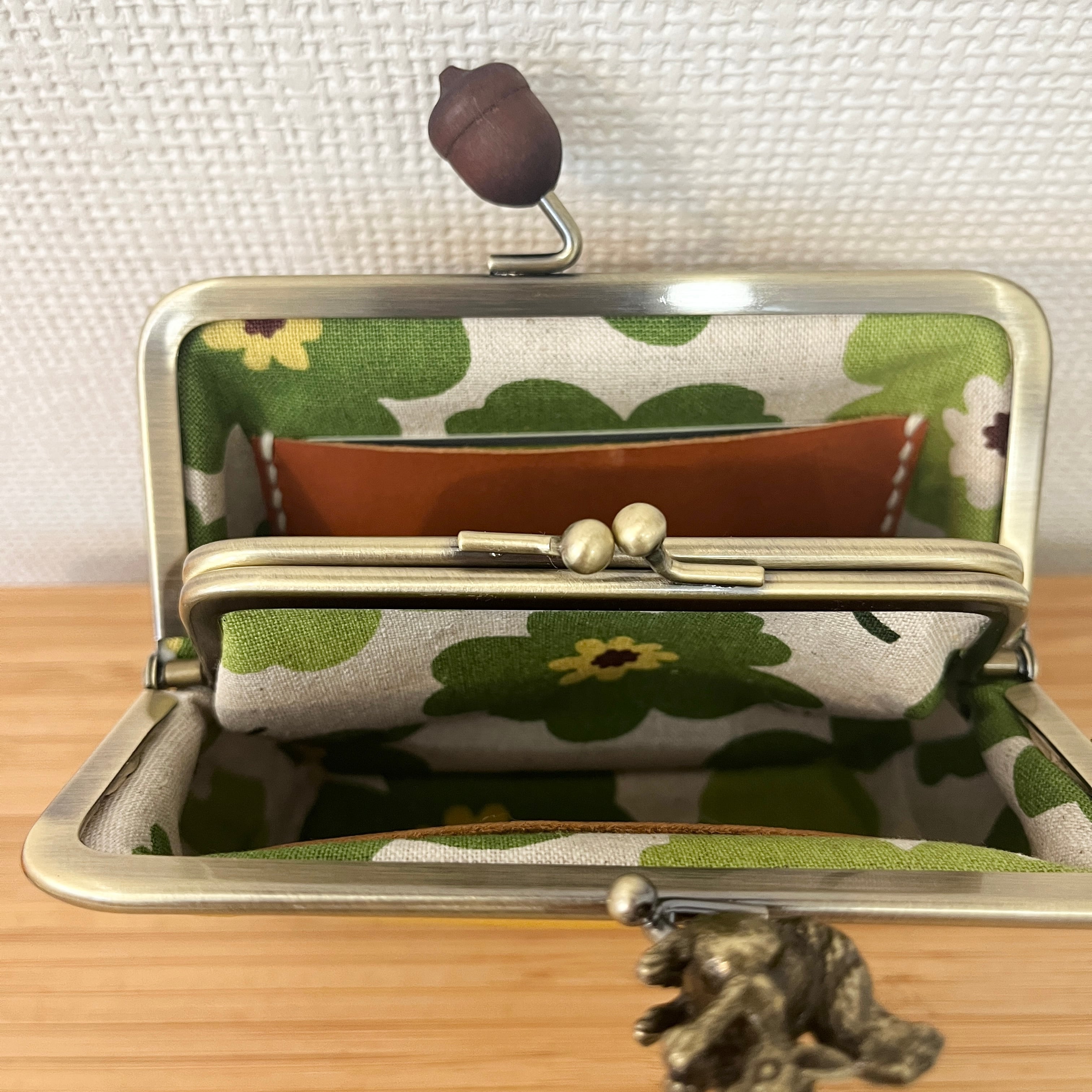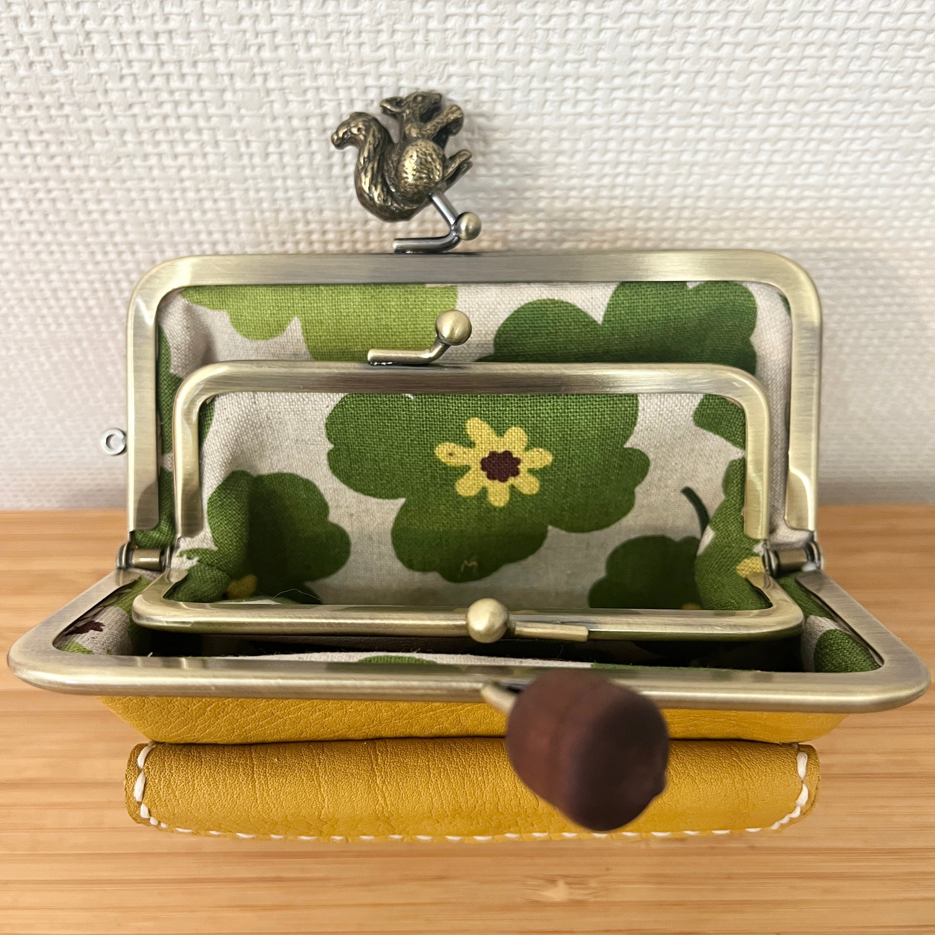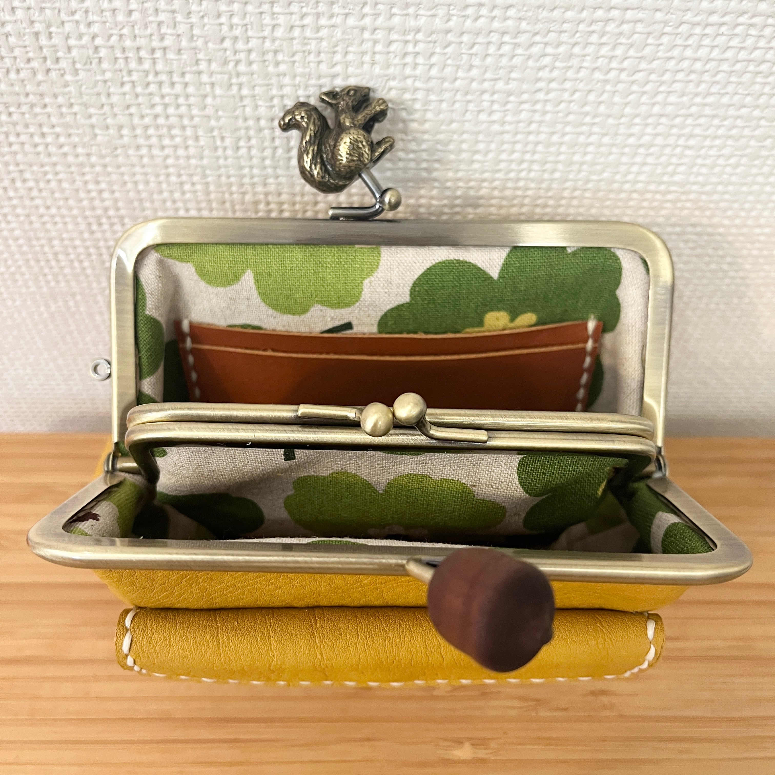 ぱかっと開くとお部屋が3つの親子がまぐち♪外ポッケが付いたリス&どんぐり口金の四角い本革ミニ財布