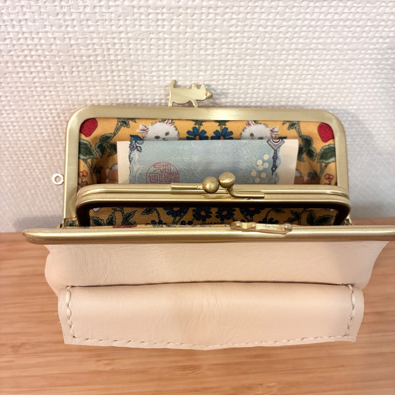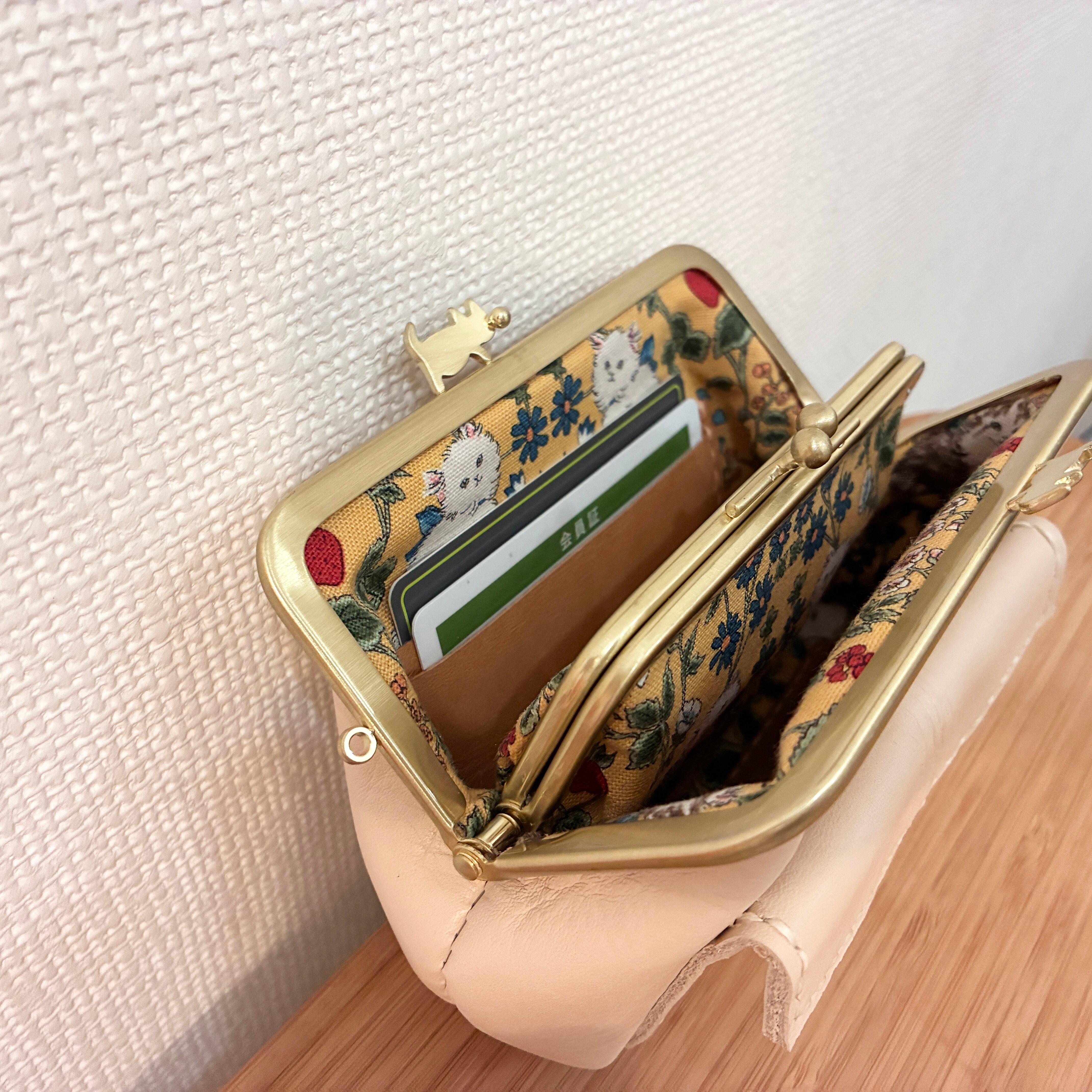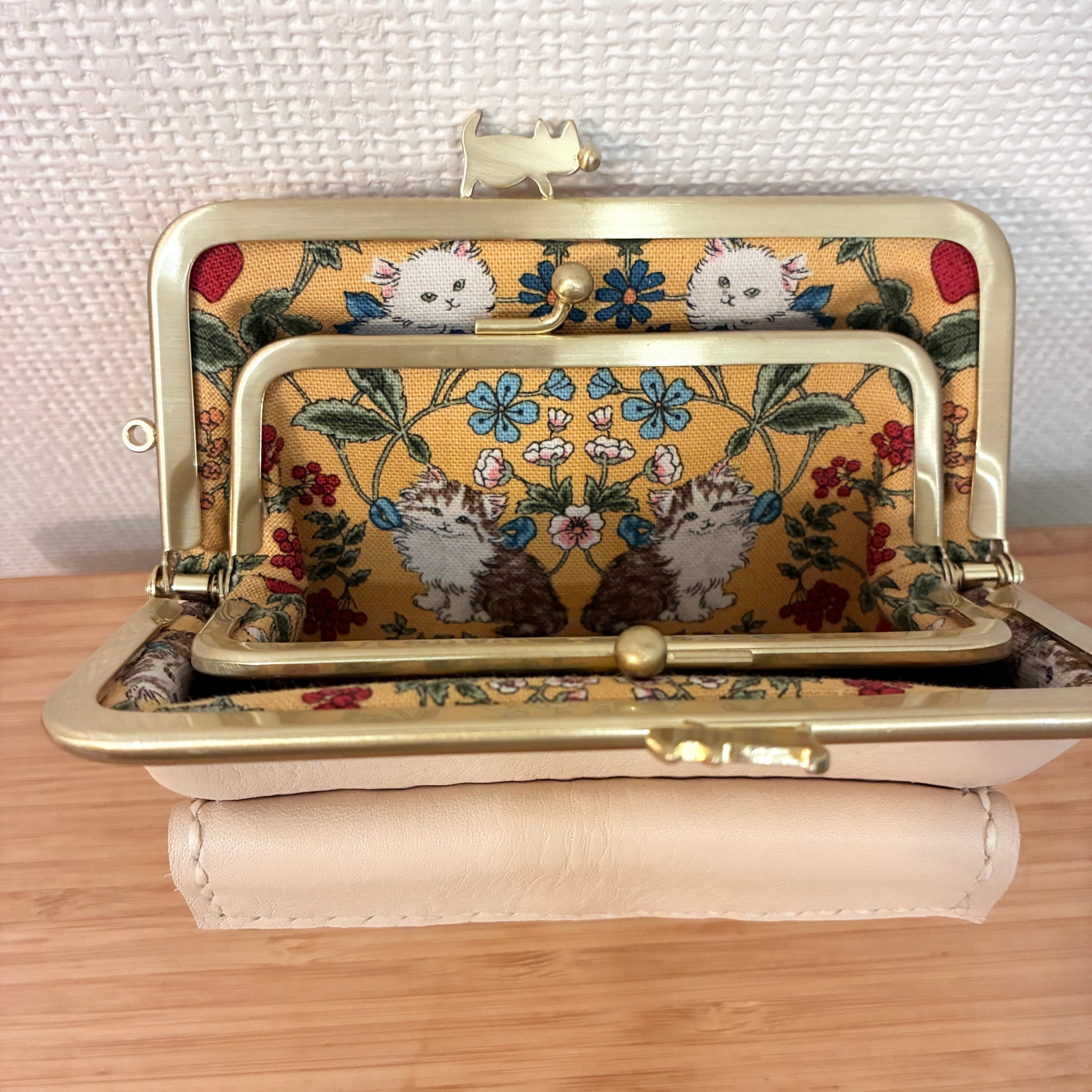 がまぐちのパッチン部分がネコさんになっている、とくべつな口金を使った親子がまぐちです。(ただし内側の子がまぐちは普通の口金となっております。画像にてご確認くださいませ)