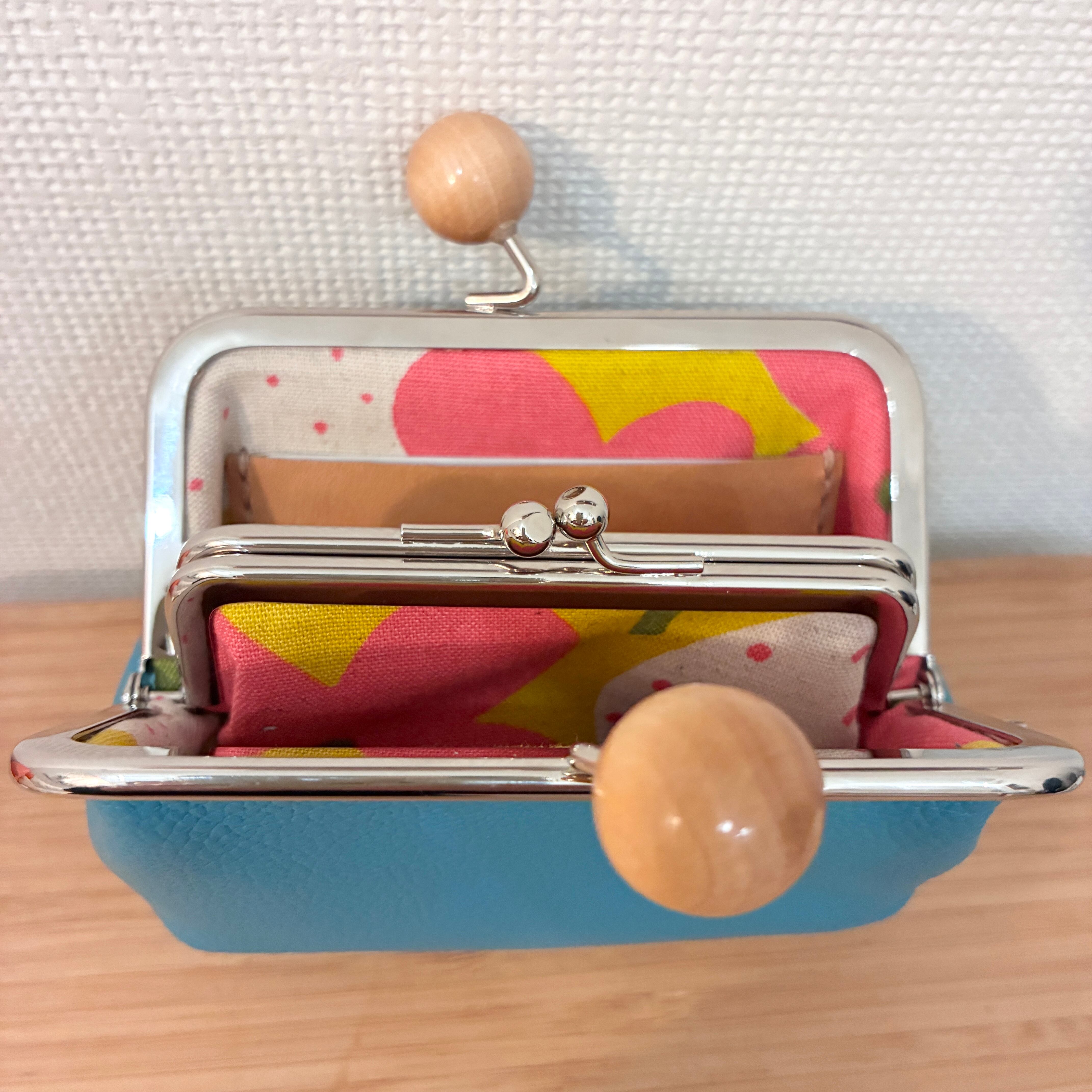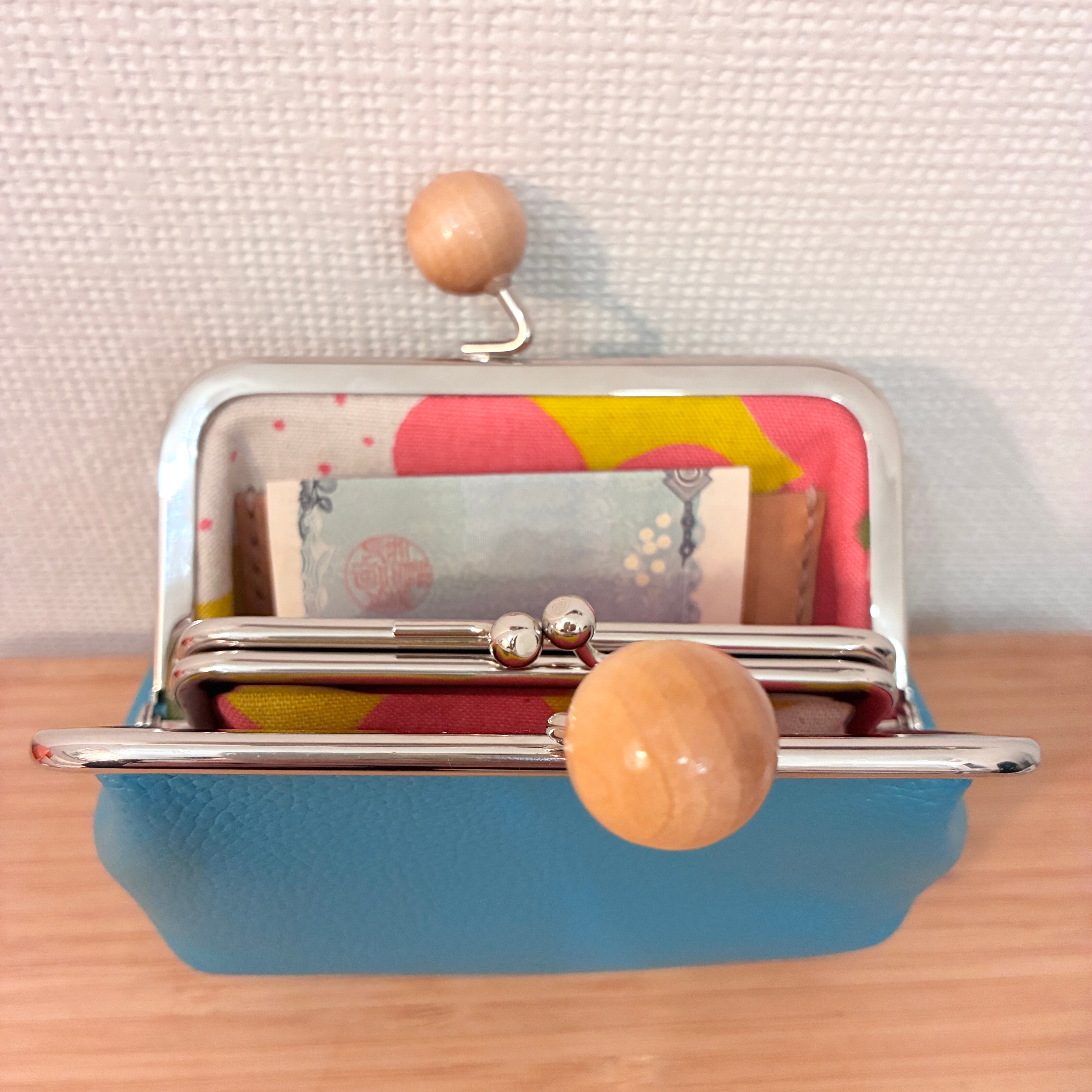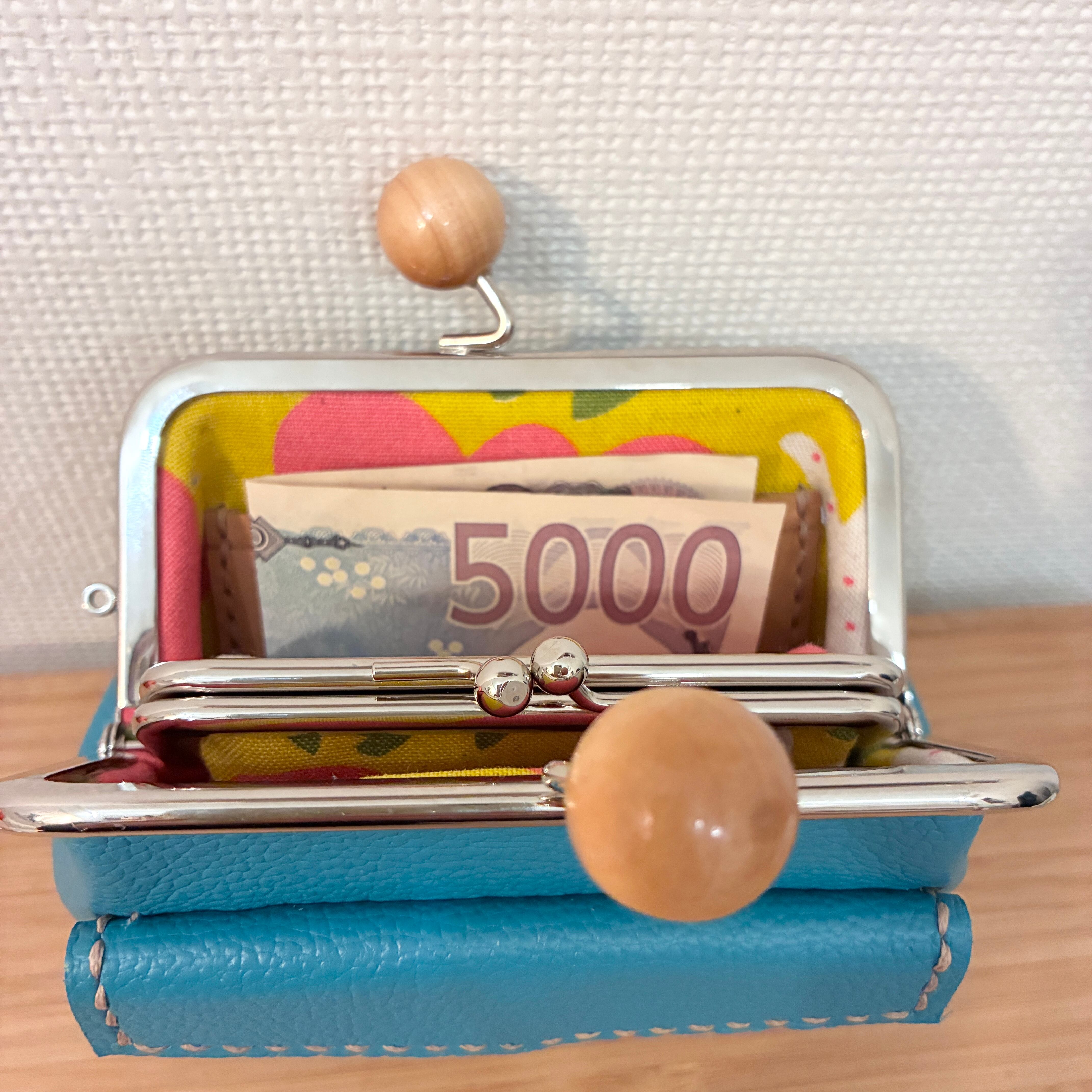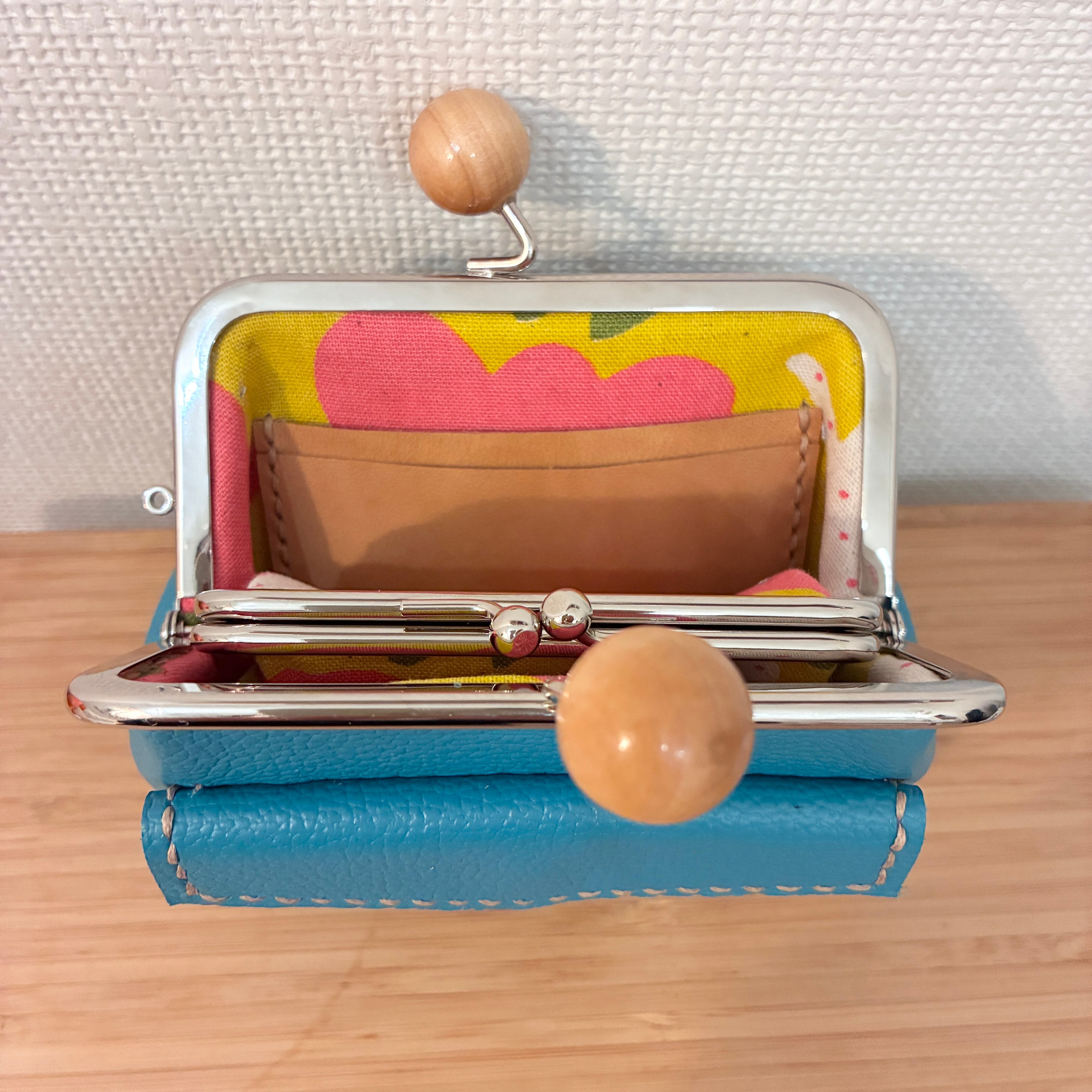ぱかっと開くとお部屋が3つの親子がまぐち♪外ポッケが付いた木玉口金の本革ミニ財布