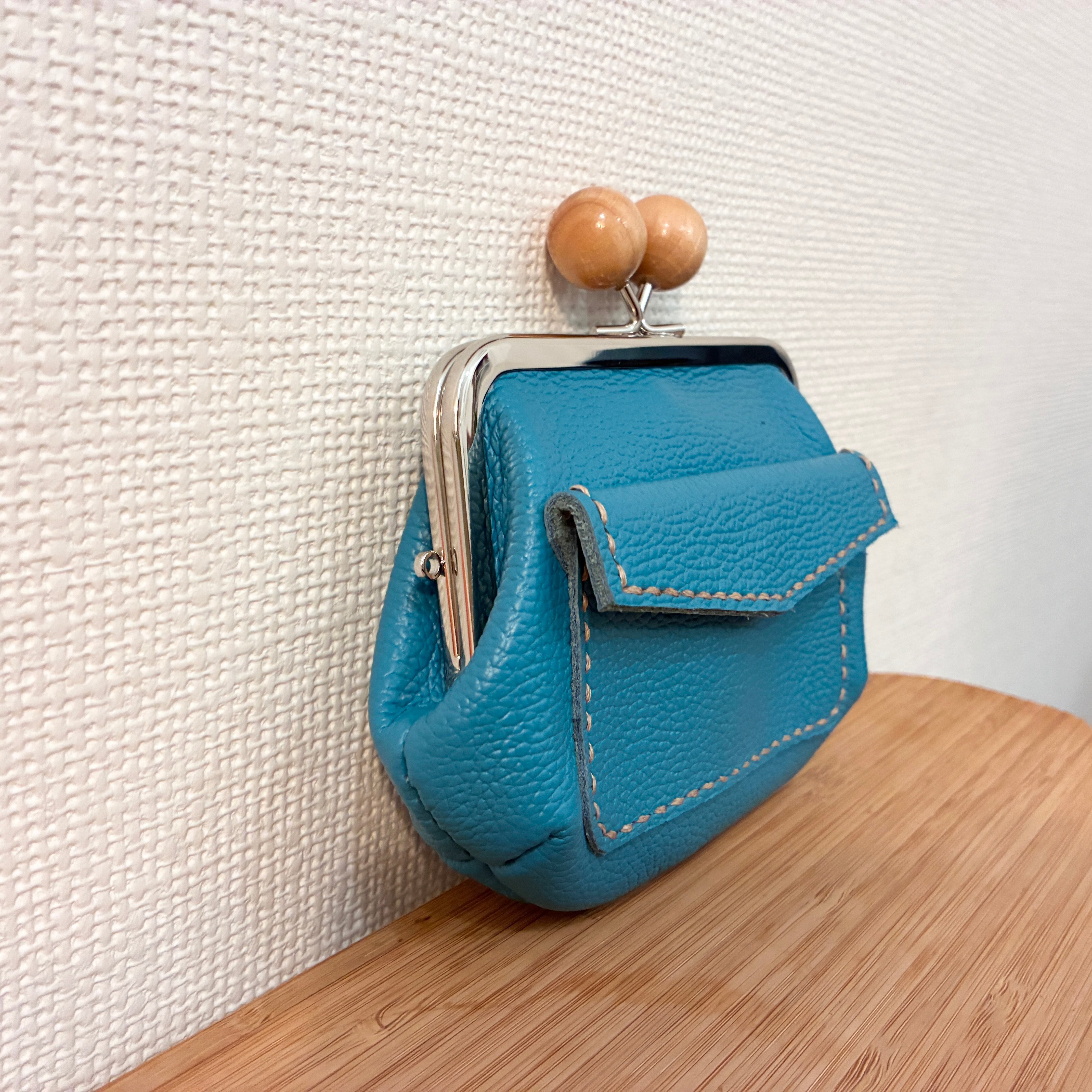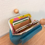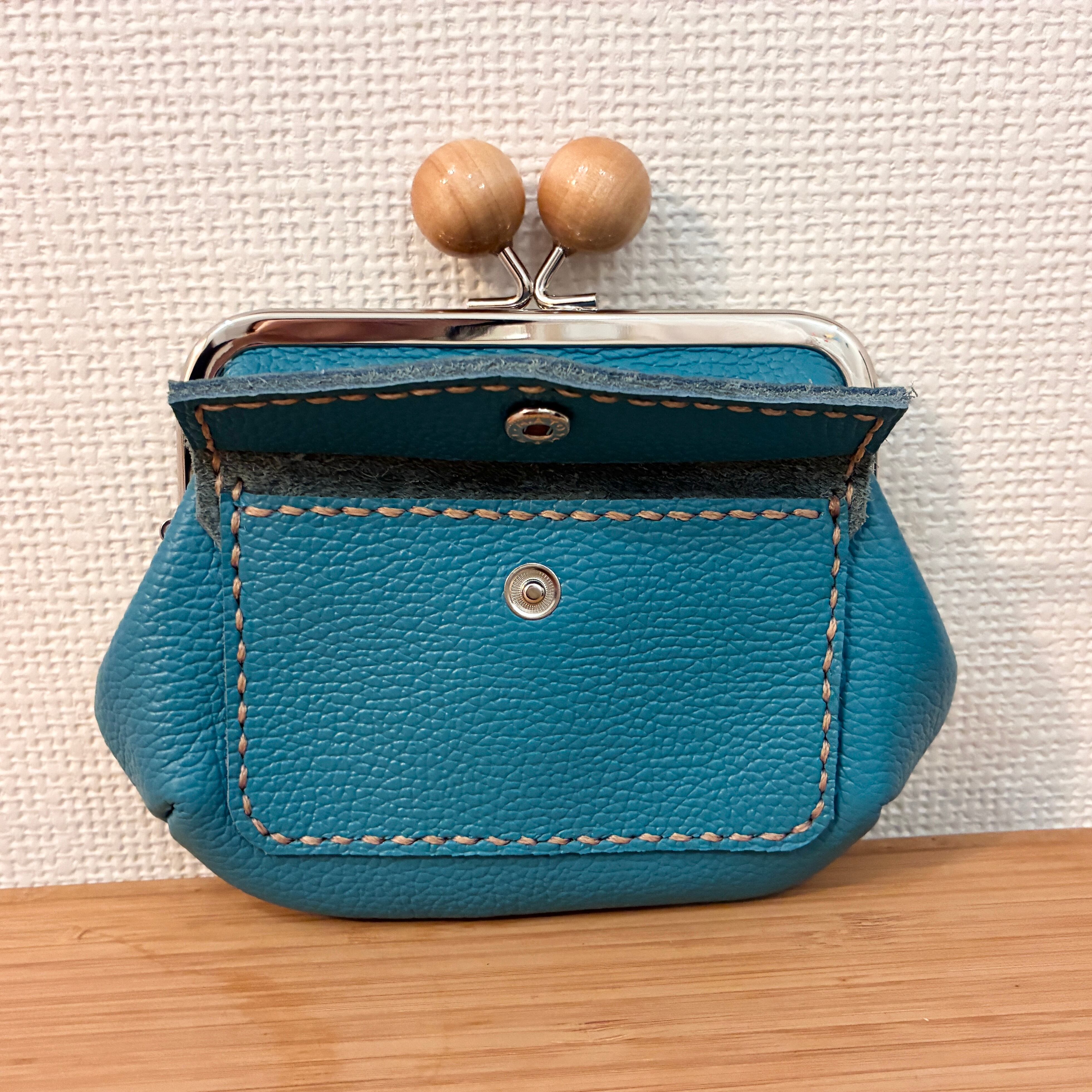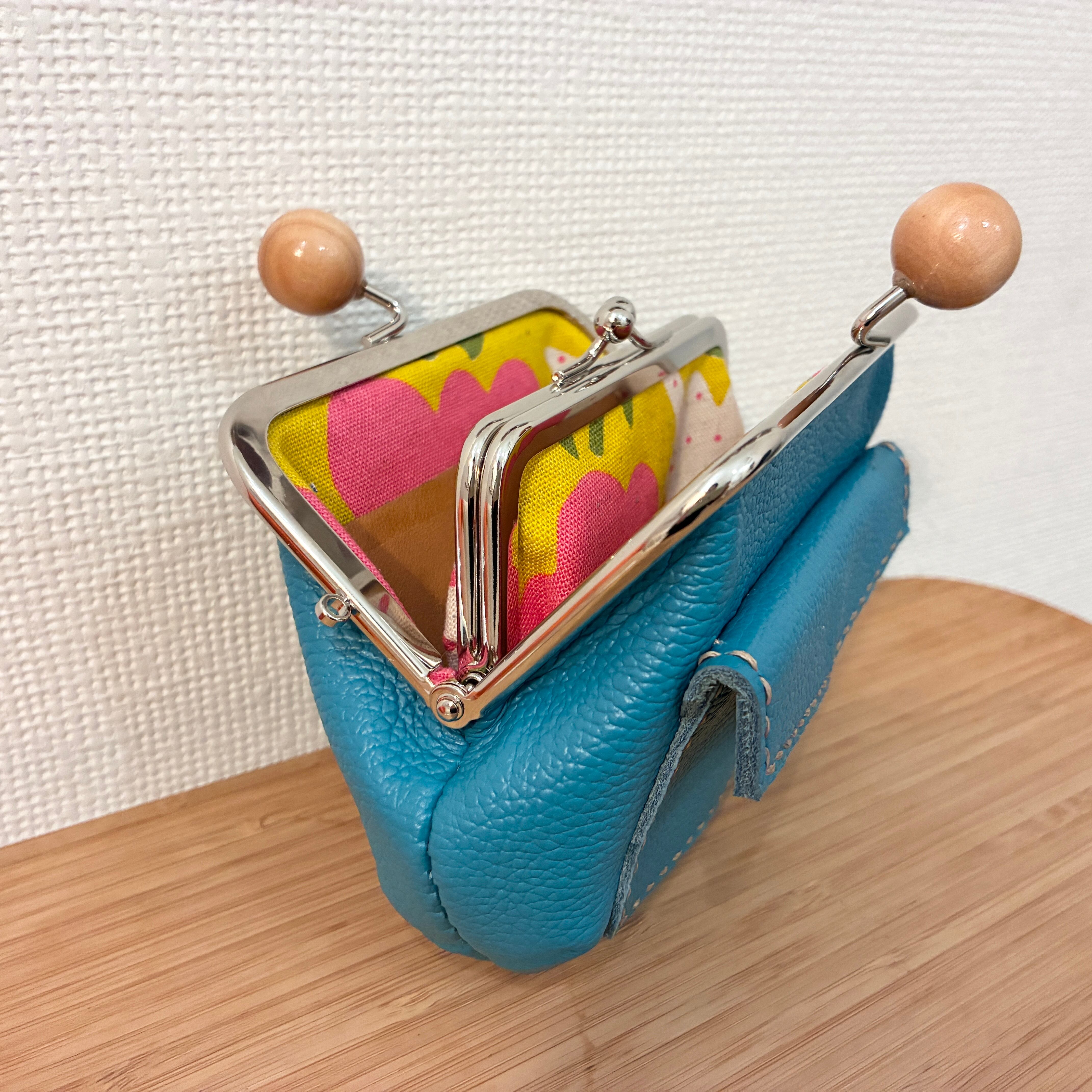 ぱかっと開くとお部屋が3つの親子がまぐち♪外ポッケが付いた木玉口金の本革ミニ財布
