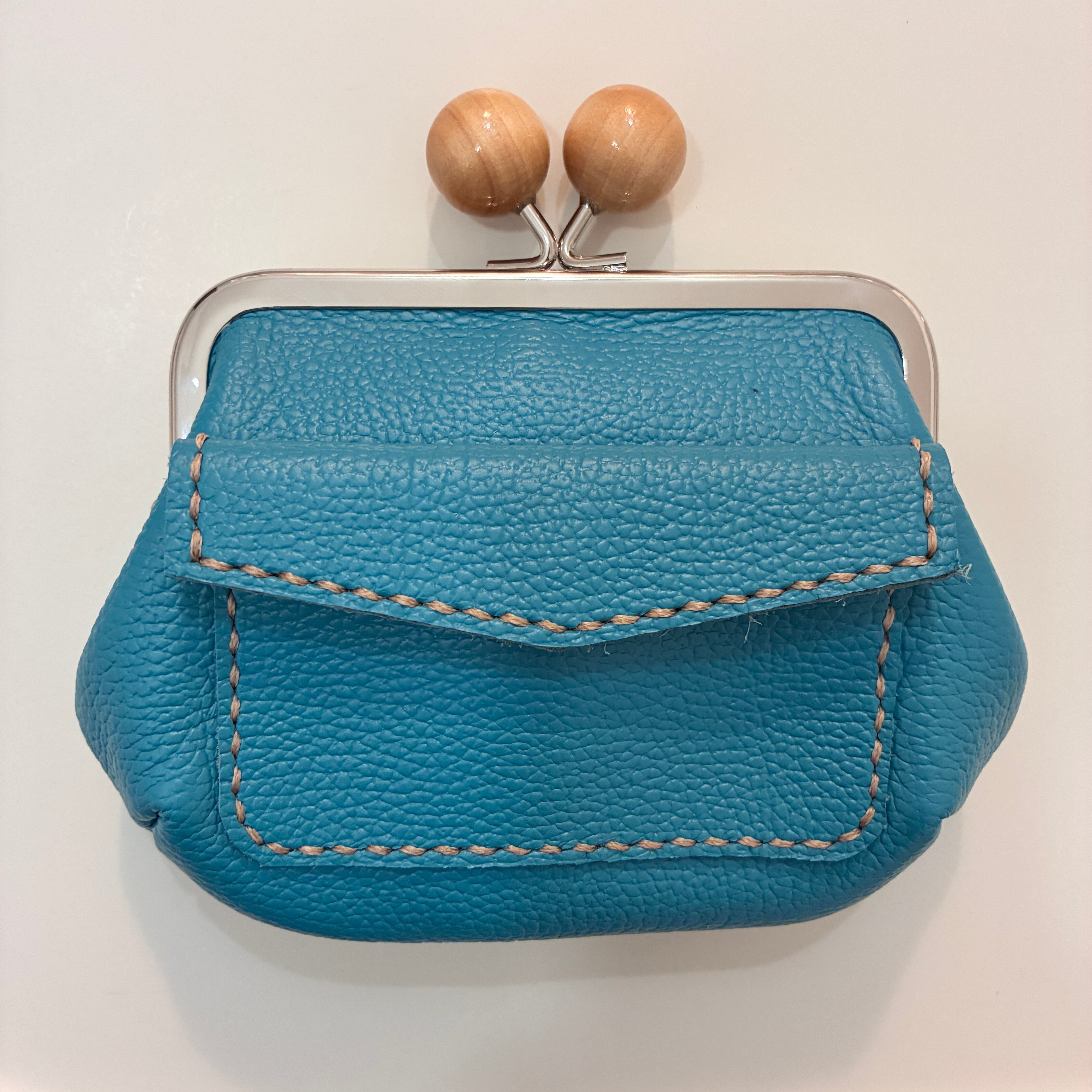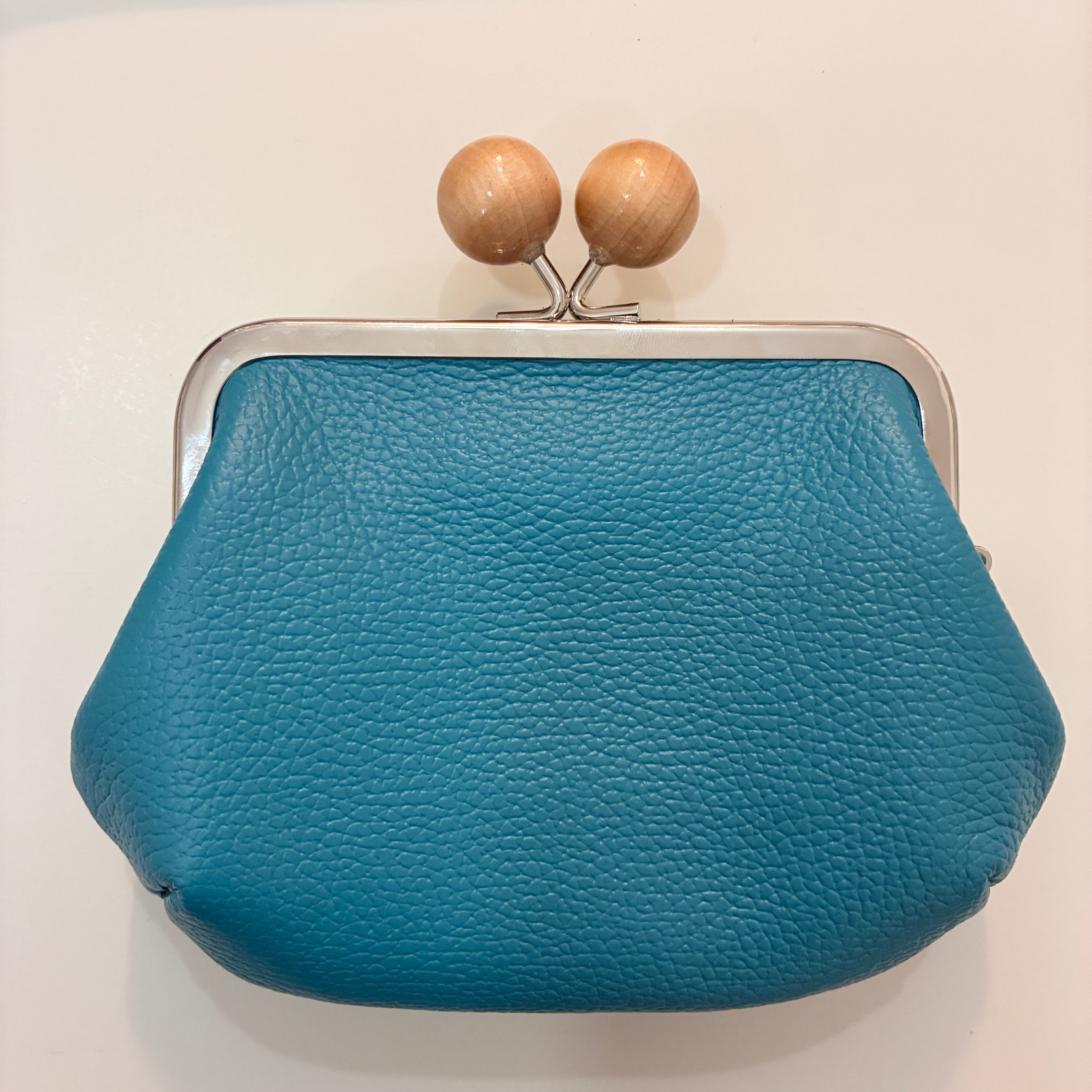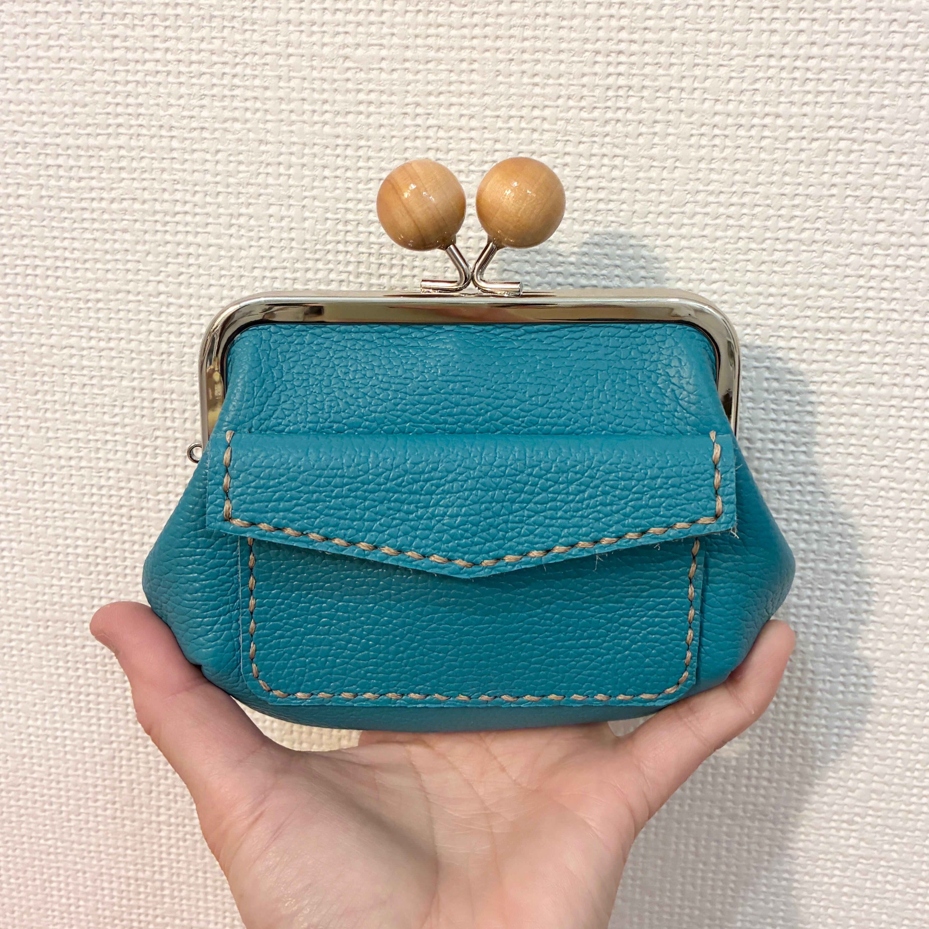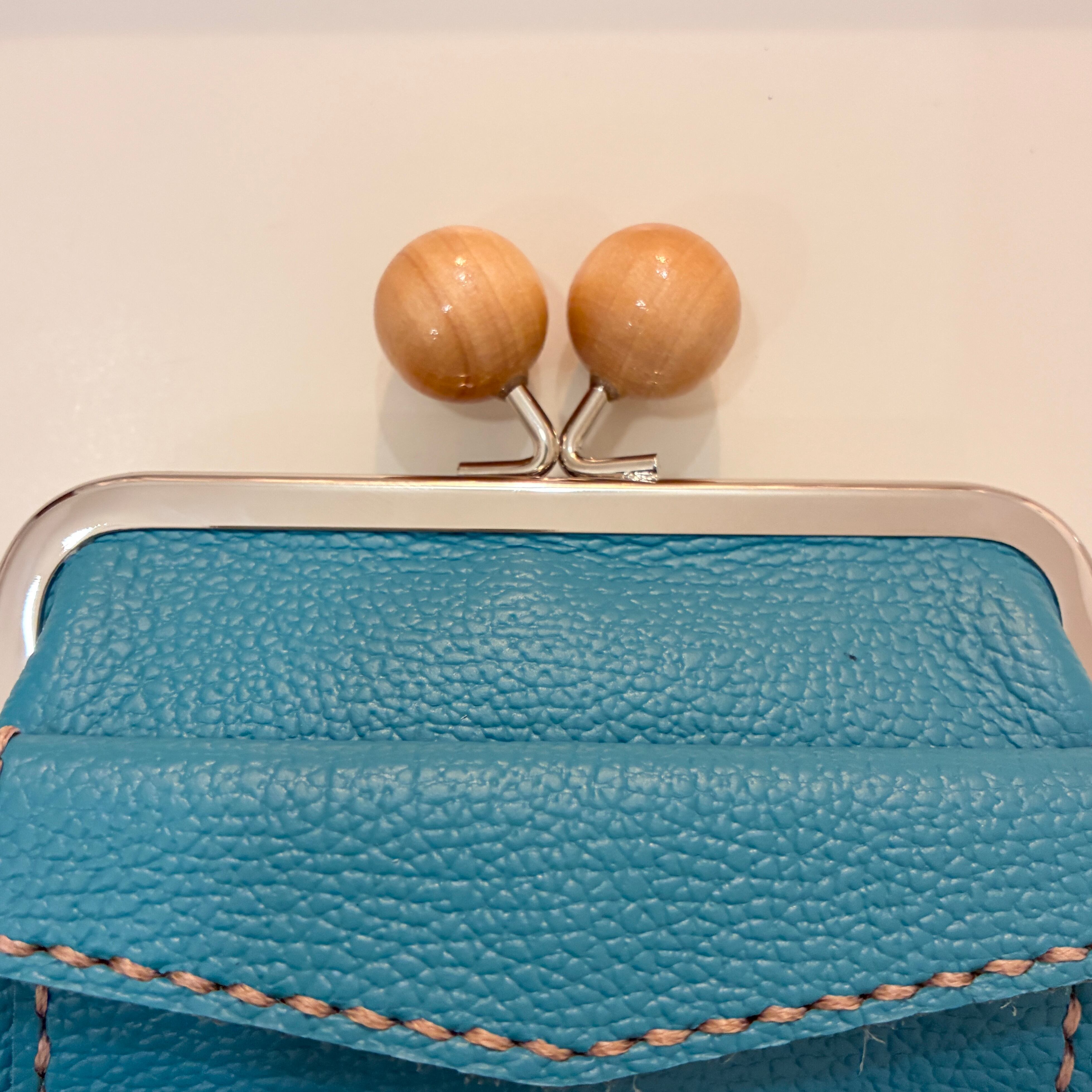 ぱかっと開くとお部屋が3つの親子がまぐち♪外ポッケが付いた木玉口金の本革ミニ財布