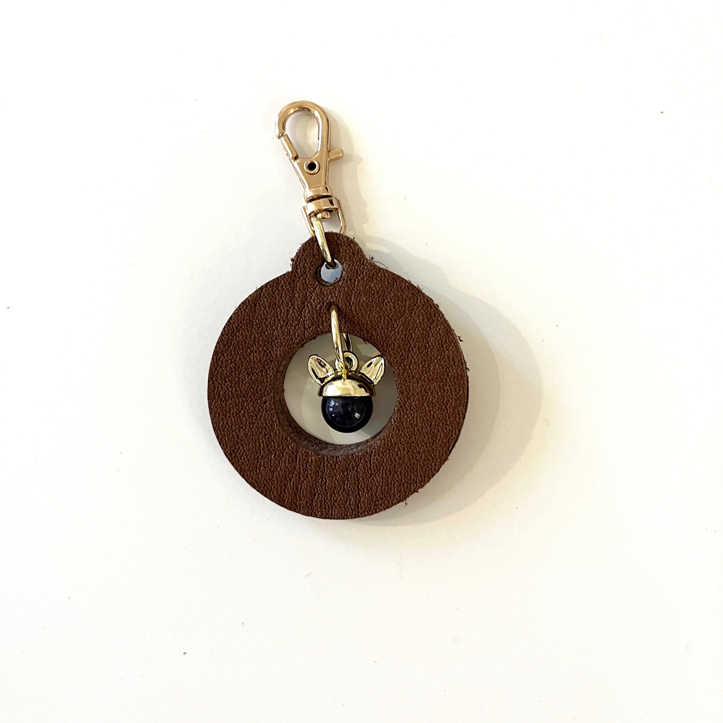 ネコちゃんに使われている石はアメジスト、チャームのサイズは革部分が直径約3.6cm、金具を含めた全体の高さは約6.5cm、ネコちゃんのサイズは約1cmです。