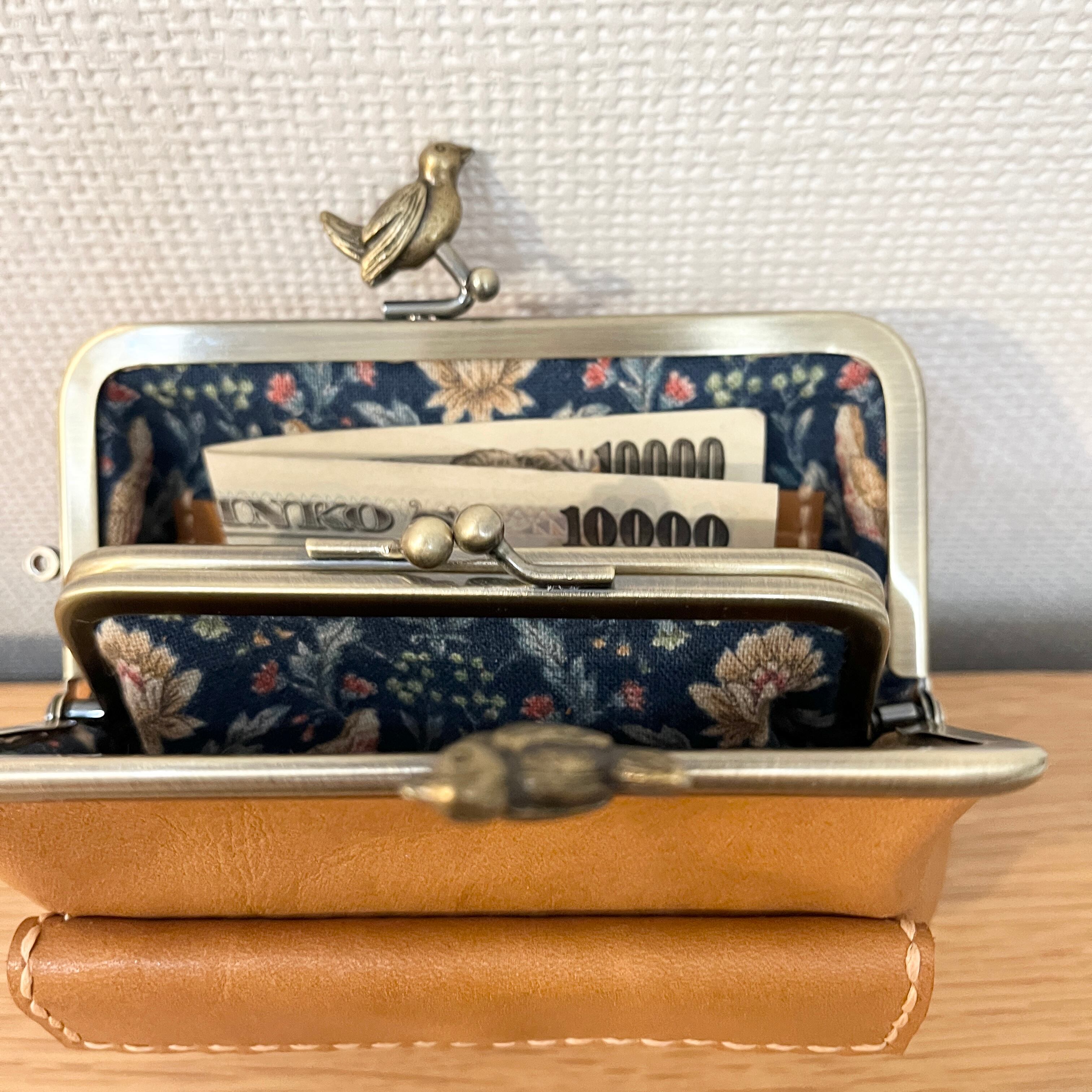 ぱかっと開くとお部屋が3つの親子がまぐち♪外ポッケが付いた小鳥口金の四角い本革ミニ財布